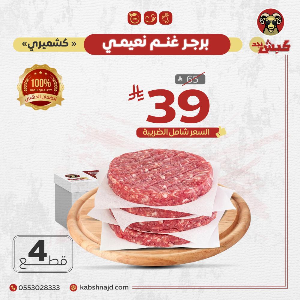 برجر غنم نعيمي كشميري مميز يحضر يوميا من لحوم النعيمي الكشميري المستورد الصافية.